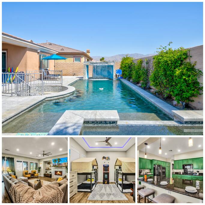 A luxury vacation home with 10 beds, 3 baths, a stunning pool with a relaxing fountain, and a spa in a scenic mountain views! One of the most LOVED destinations in Palm Springs and Palm Desert! Nearby golf, national park, and desert adventures. - Spacious Living Area - Full Kitchen - Arcade games - Coffee Station & Mini Bar - Erg desk and Chair - Board Games - EV charger - Pool & Jacuzzi - Fire Pit & BBQ Area - Pool chairs and loungers - Fountain - In-Pool Bar seating Book now!!!